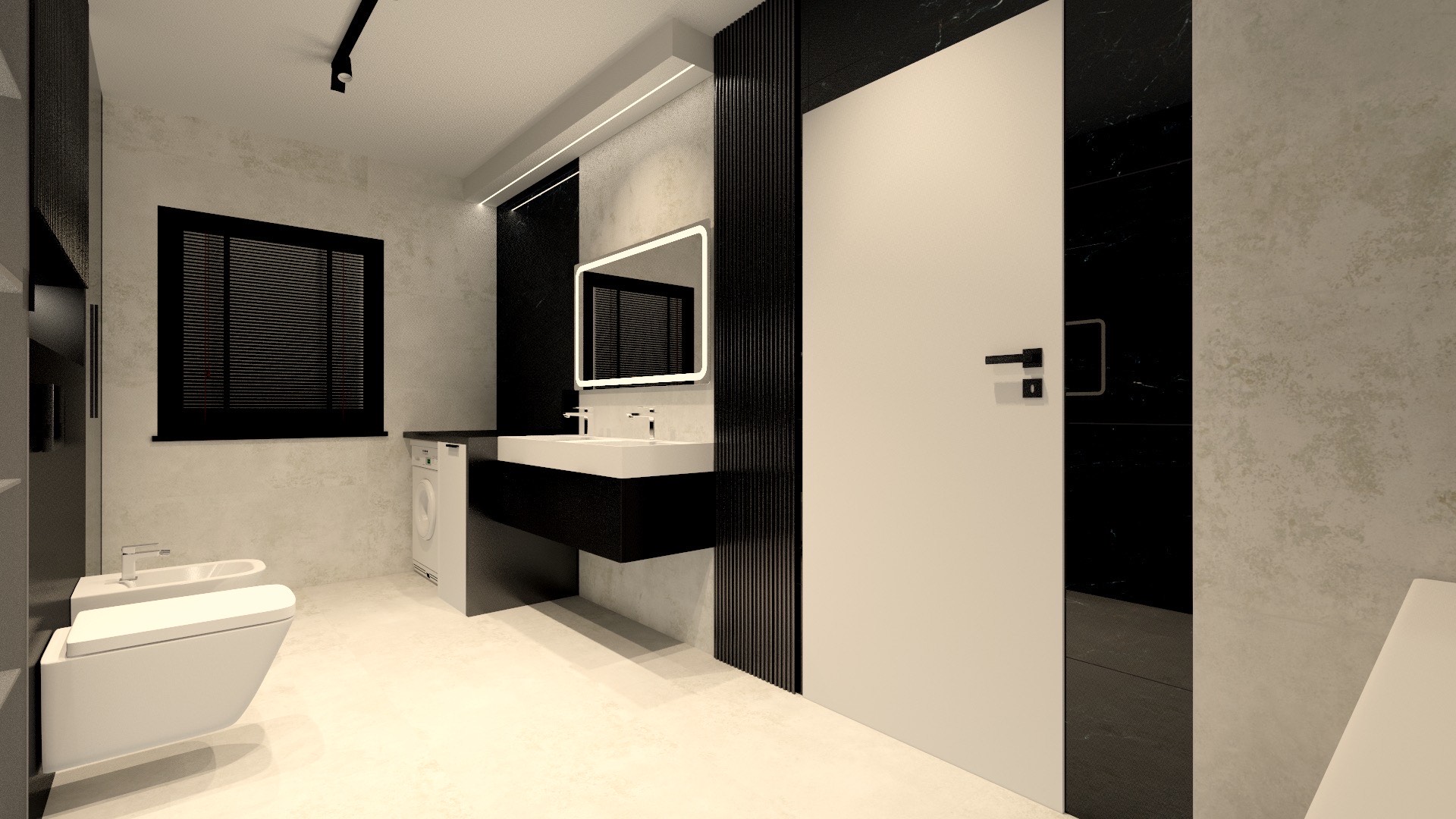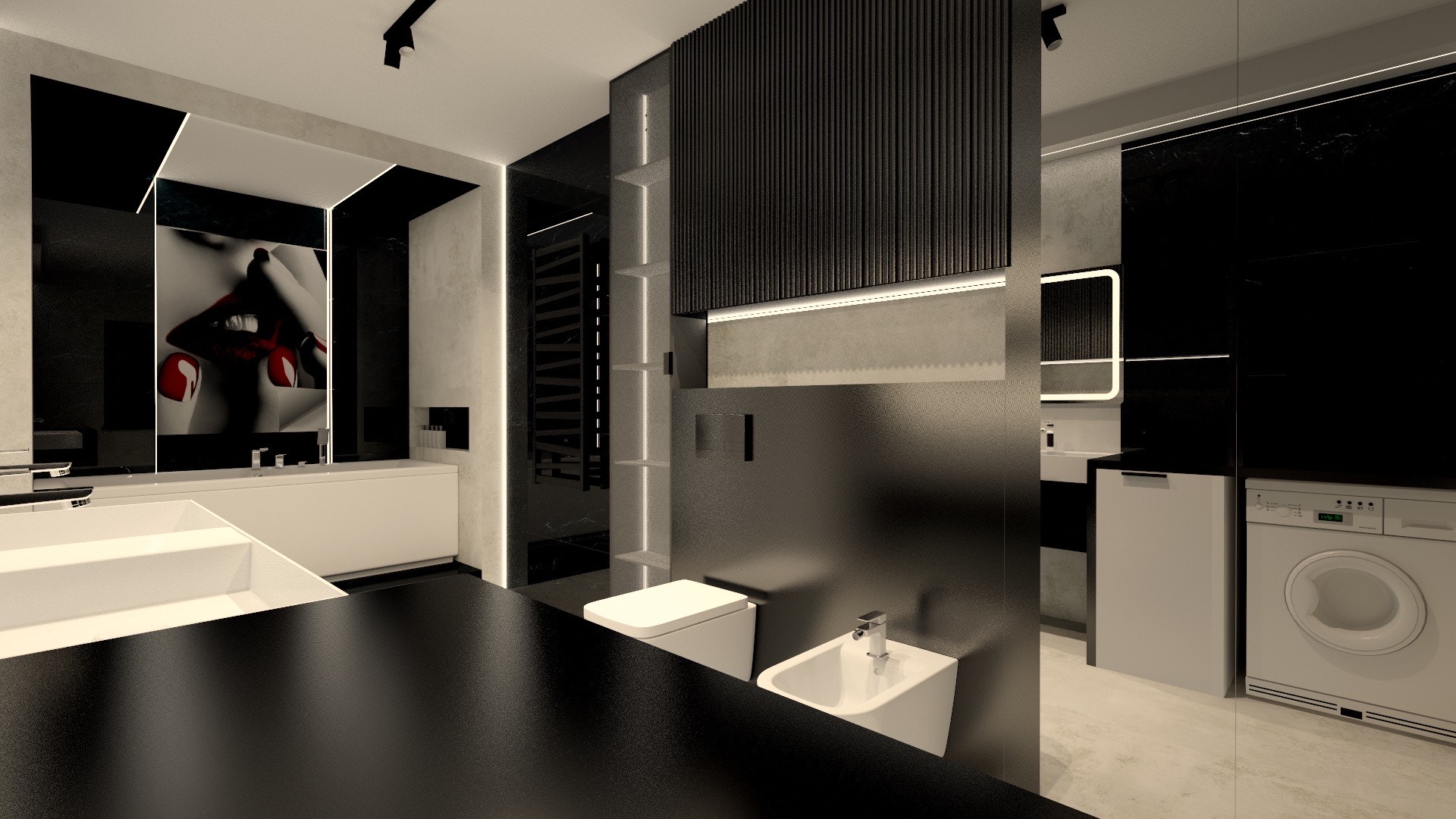 This design is dominated by a striking contrast between black and a light concrete background, creating a powerful yet timeless visual effect. The glossy black wall and textured slats add depth and character to the space, while the modern ladder radiator emphasizes the industrial feel of the interior.