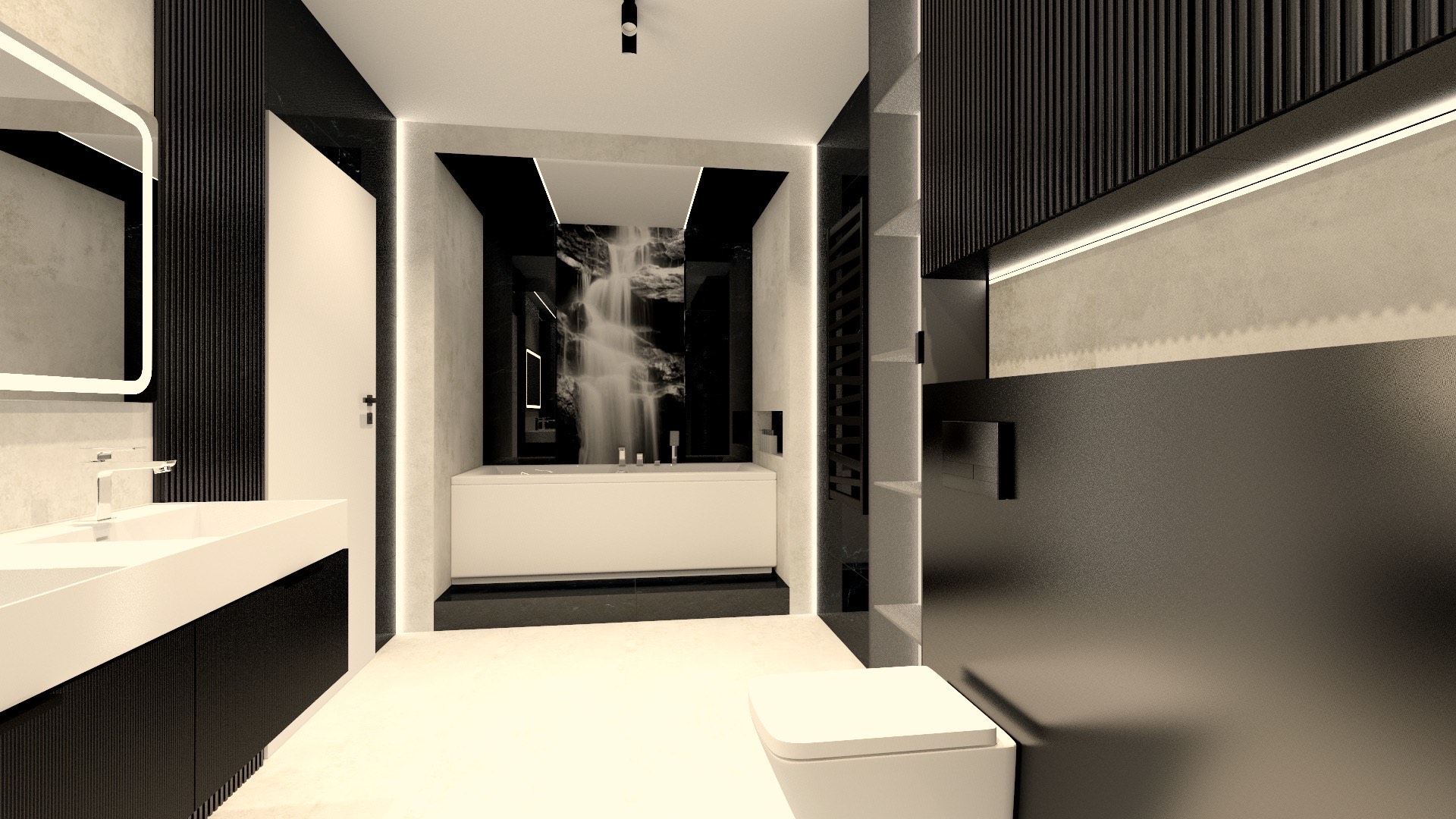 Suspended sanitary ceramics ensure lightness and ease of cleaning, while thoughtful linear lighting creates an intimate atmosphere. A geometric washbasin on a contrasting cabinet completes the composition, combining functionality with modern aesthetics.